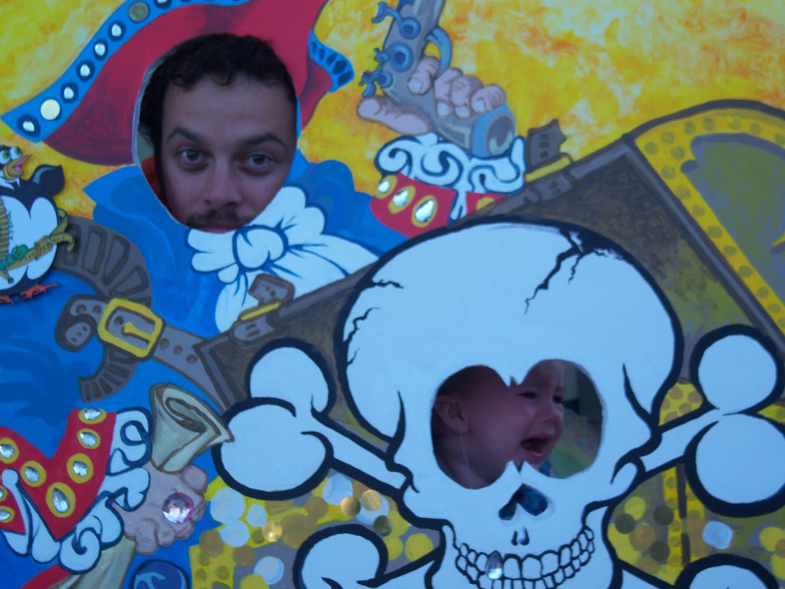 The next day, we had Lucy's birthday party at Hacienda Hughes. It was a pirate theme, and true to form, Dad had to create something EXTRAVAGANT for the kids to enjoy. So he drew a giant cardboard cutout of a pirate...complete with a 3D bird and doubloons!